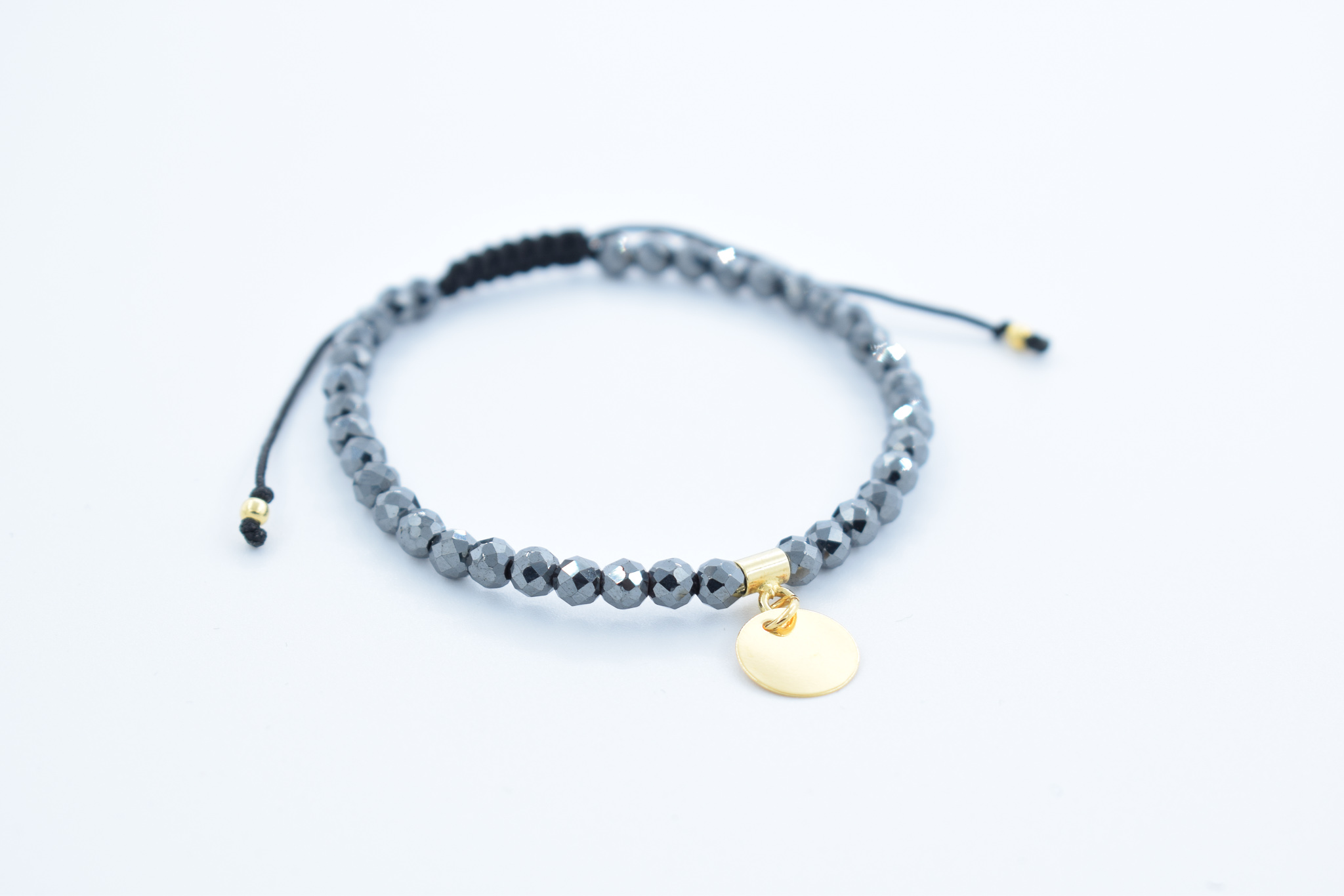 Bratara personalizata realizata manual cu pietre semipretioase Hematit gri si banut Argint 925 placat cu aur, 10mm