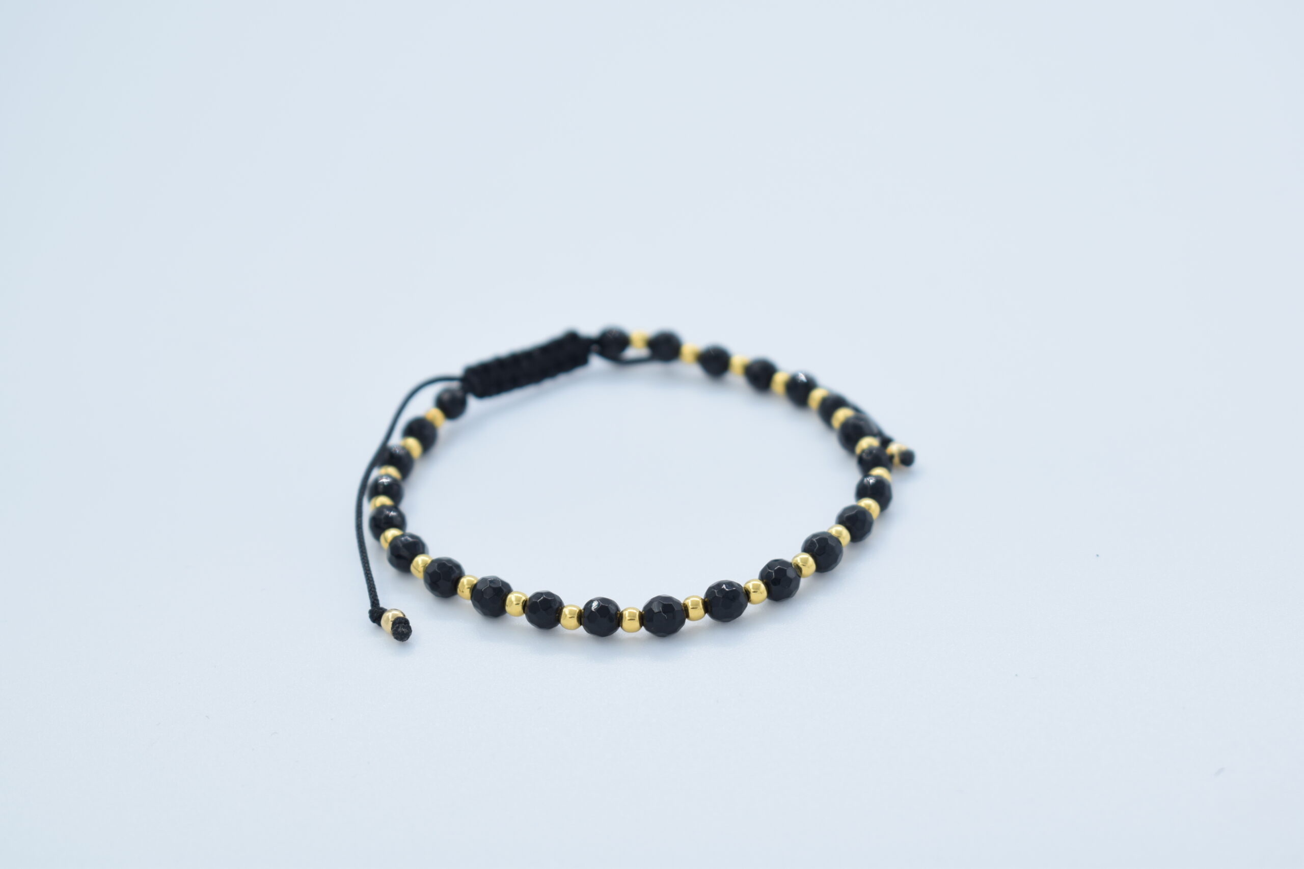 Brățară reglabilă realizată manual din șnur negru împletit și pietre semiprețioase din Onix. Această brățară este ușoară și confortabilă pentru a fi purtată zilnic.