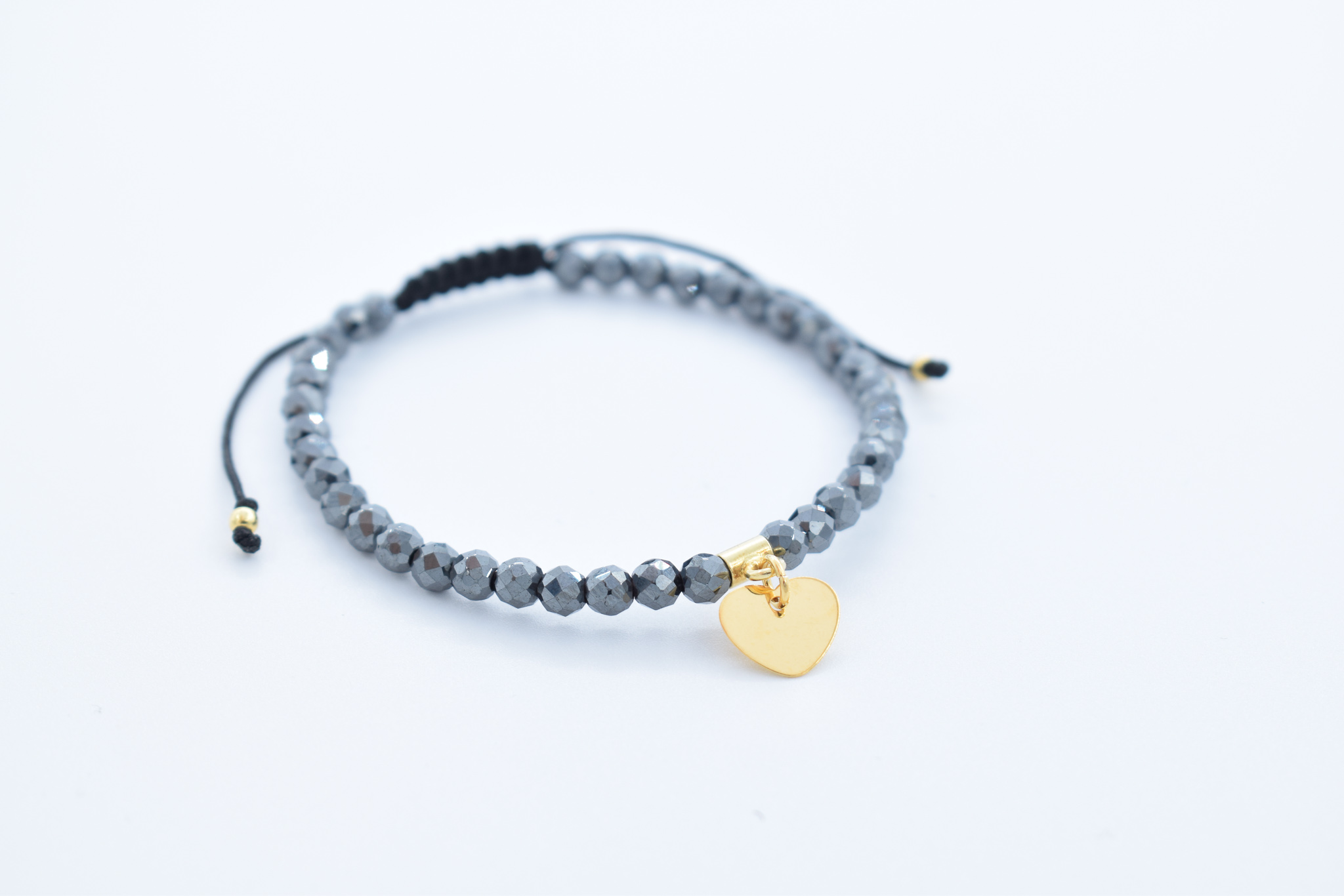 Bratara personalizata realizata manual cu pietre semipretioase Hematit gri si inima Argint 925 placat cu aur, 10mm
