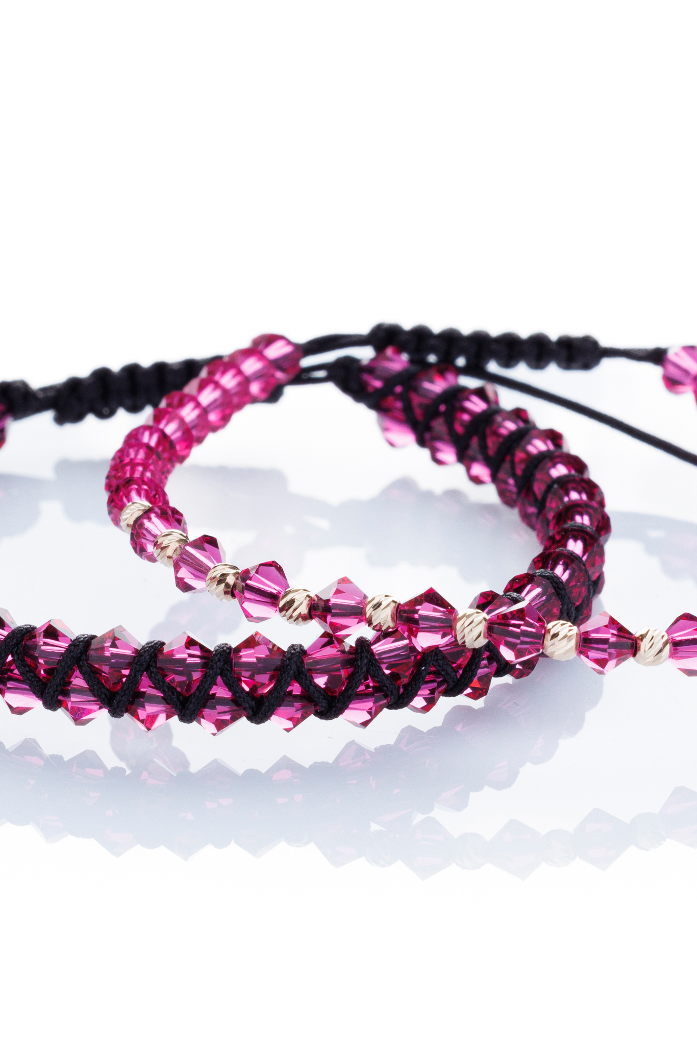Brățară reglabilă realizată manual din șnur negru împletit și cristal Preciosa roz. Această brățară este ușoară și confortabilă pentru a fi purtată zilnic. Brățările sunt bijuterii care pot adăuga o notă de eleganță și stil personal oricărei ținute.