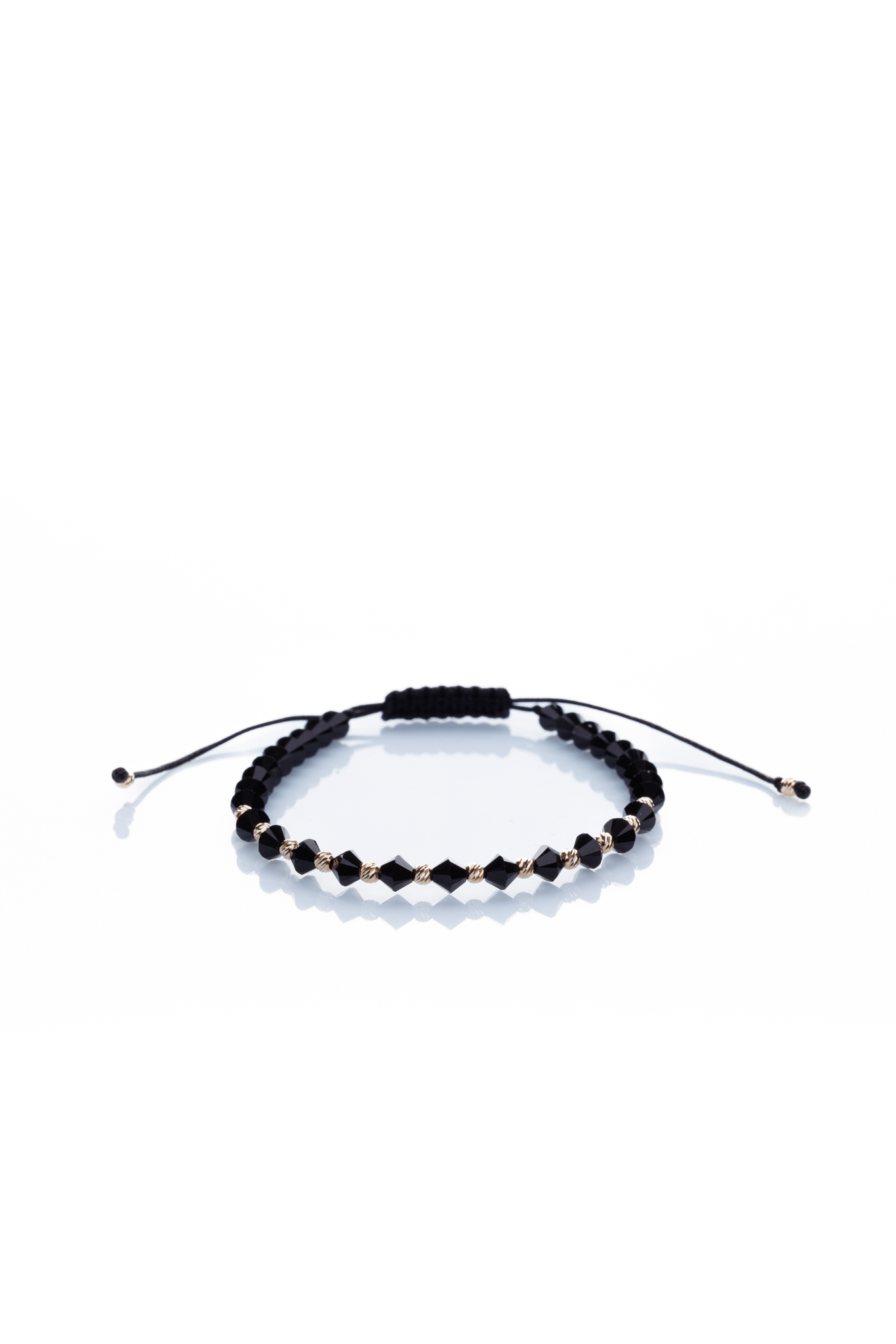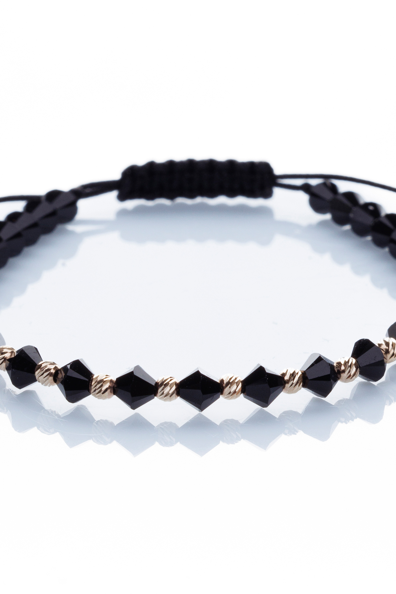 Brățară reglabilă realizată manual din aur de 14k și decorată cu cristale Preciosa biconice negre. Cu o greutate de doar 0.40 grame, această brățară este ușoară și confortabilă pentru a fi purtată zilnic.