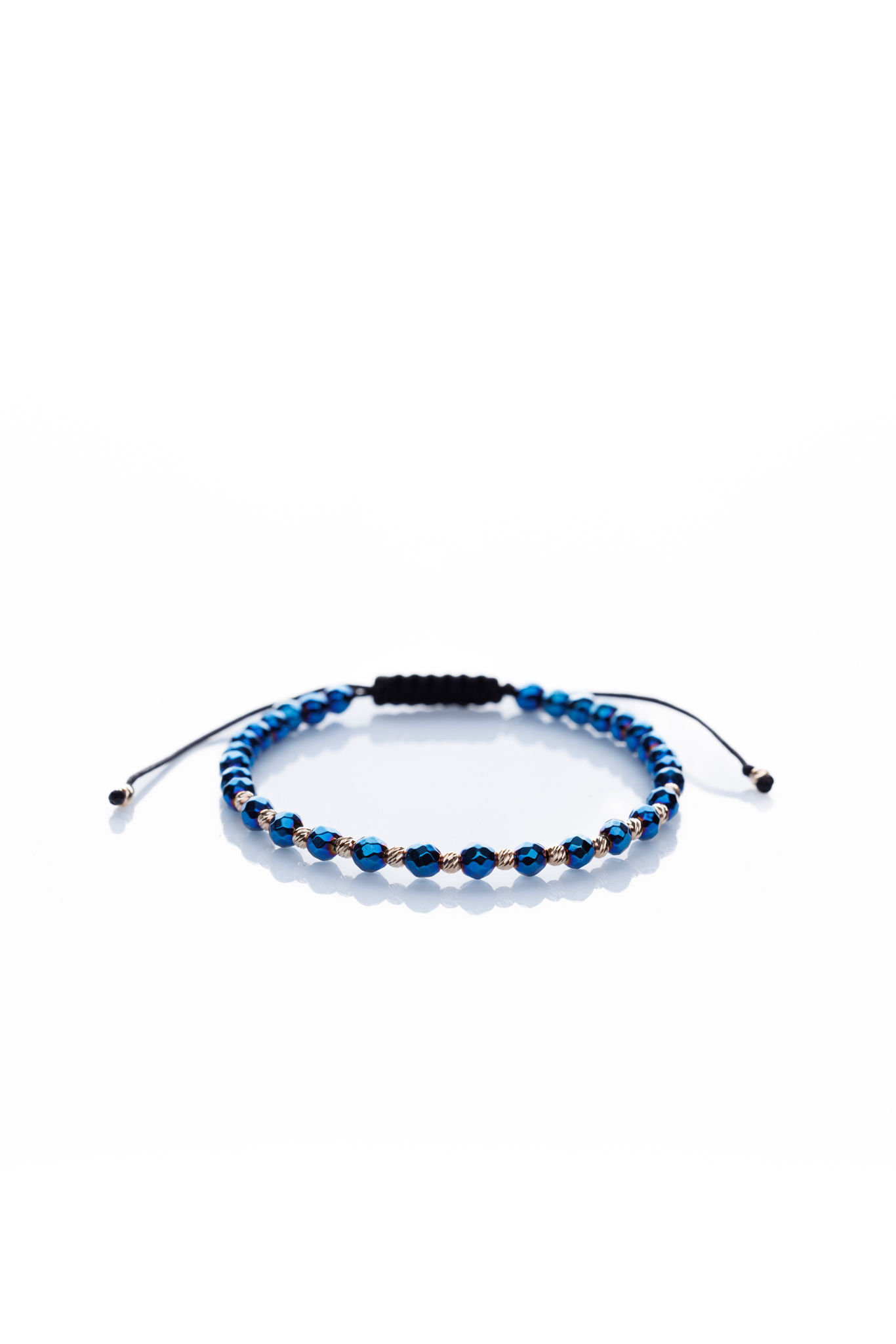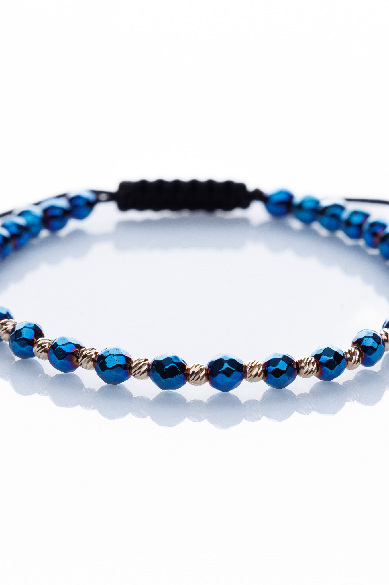 Brățară reglabilă realizată manual din aur de 14k și decorată cu pietre semiprețioase de Hematit albastru fațetat. Cu o greutate de doar 0.40 grame, această brățară este ușoară și confortabilă pentru a fi purtată zilnic.