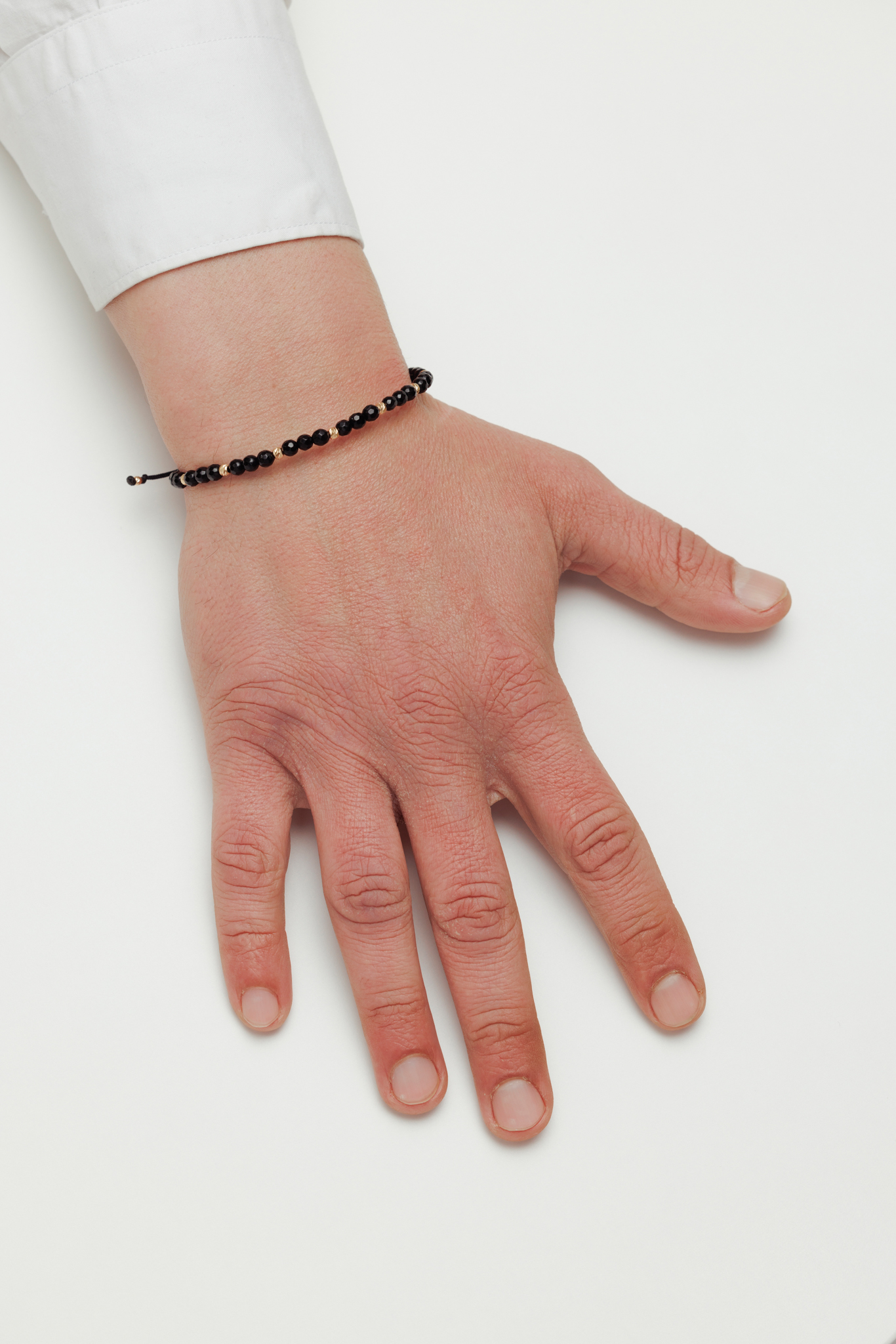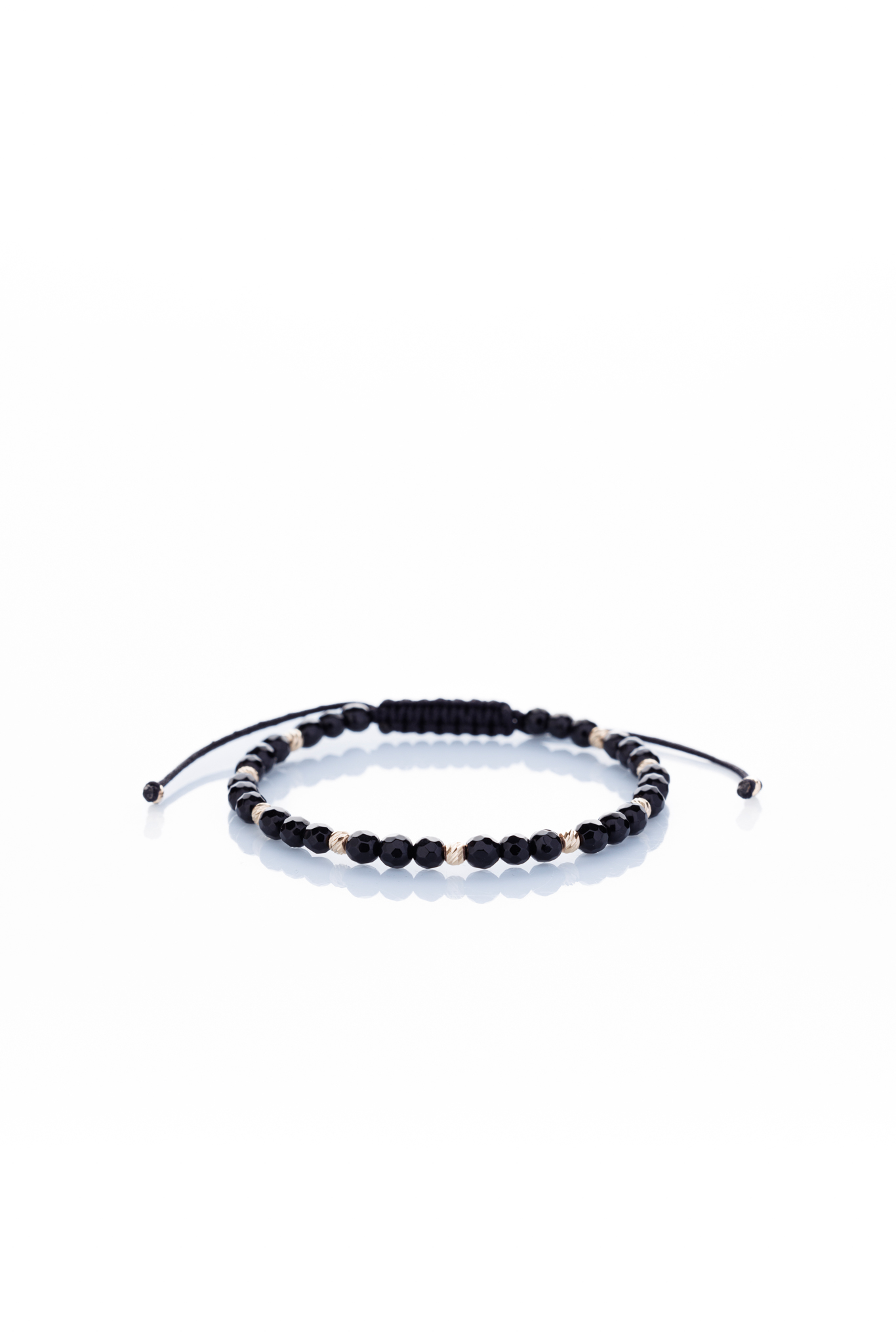 Brățară reglabilă realizată manual din aur de 14k și decorată cu pietre semiprețioase de Onix negru fațetat. Cu o greutate de doar 0.49 grame, această brățară este ușoară și confortabilă pentru a fi purtată zilnic.