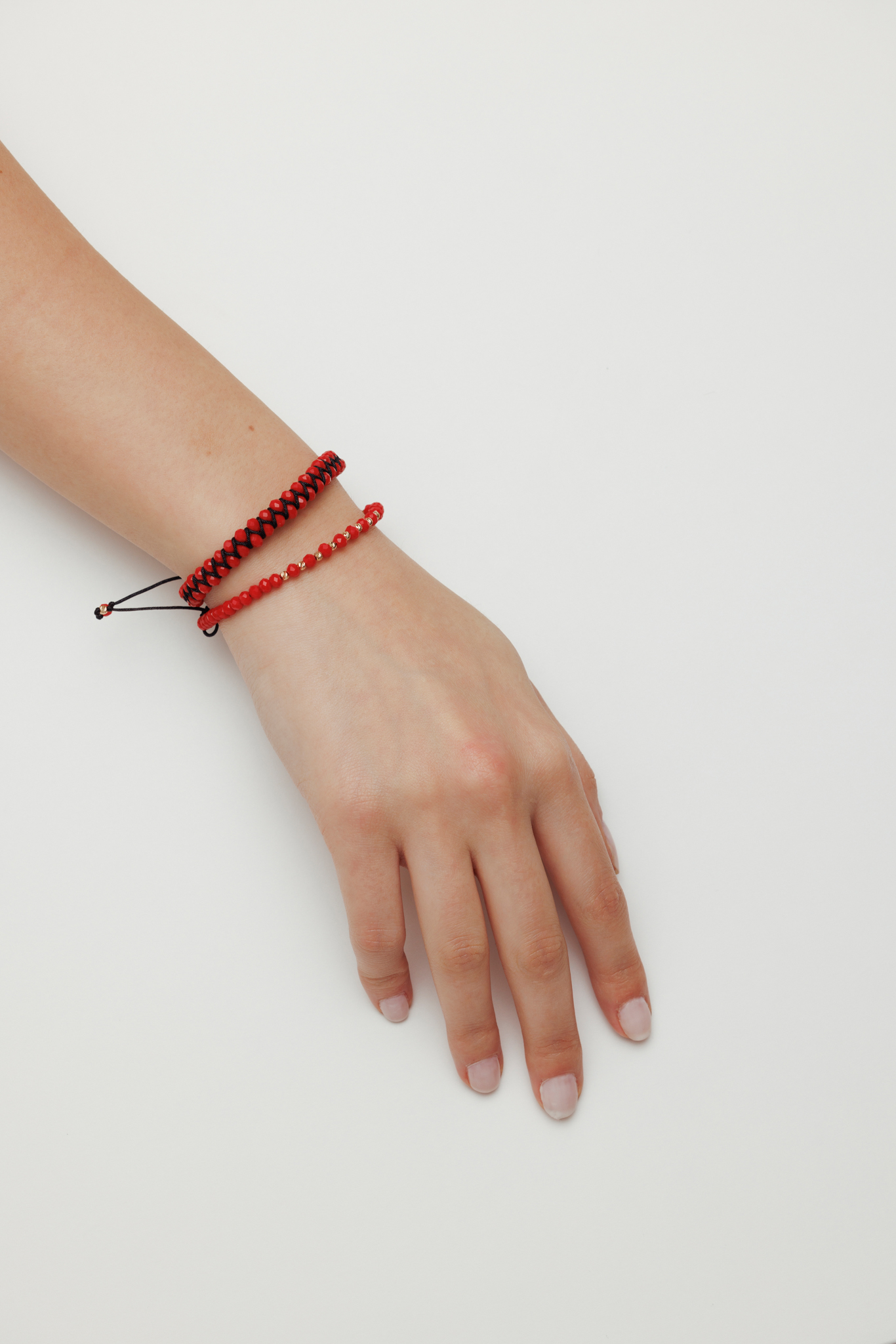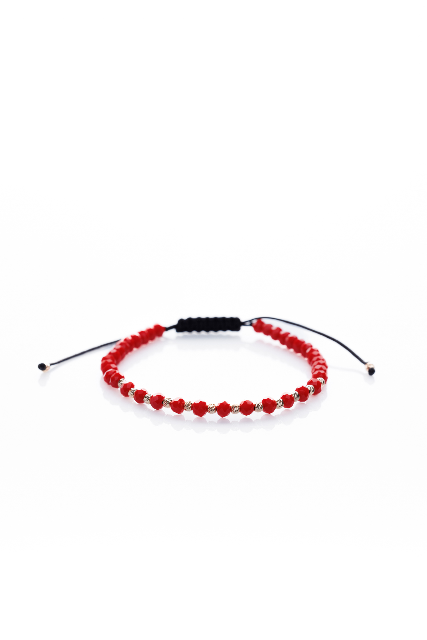 Brățară reglabilă realizată manual din aur de 14k și decorată cu pietre din cristal sticlă roșu . Cu o greutate de doar 0.40 grame, această brățară este ușoară și confortabilă pentru a fi purtată zilnic.
